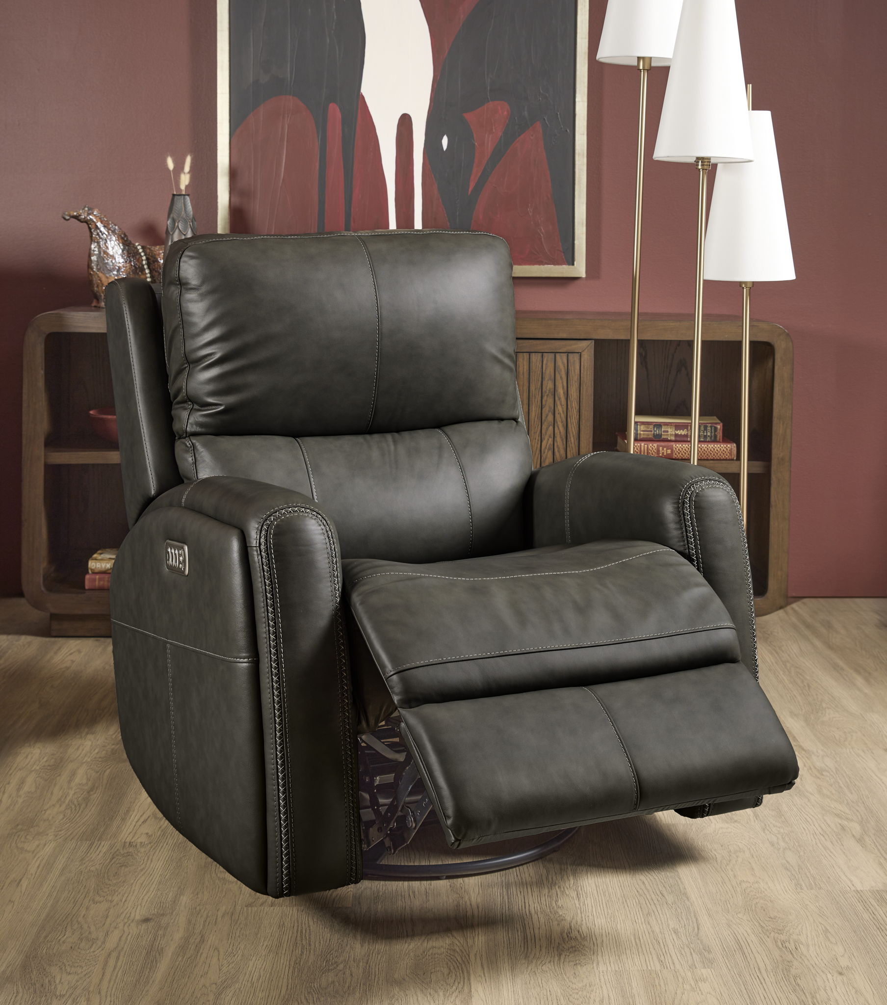 Enjoy the ultimate in ergonomics with the Linden power swivel gliding recliner with power headrest, lumbar, heat, and massage. The plush, divided back cushion supports the back while the padded track arms showcase an eye-catching cross-stitch detail. Independently adjust the recline, headrest and lumbar for a customized sit. This recliner effortlessly swivels and glides for versatile comfort, while adjustable heat and air massage features in the seat and backrest provide elevated wellness. And with Flexsteel’s Blue Steel Spring™ at the heart of the seat, the Linden swivel glider recliner is designed to last.