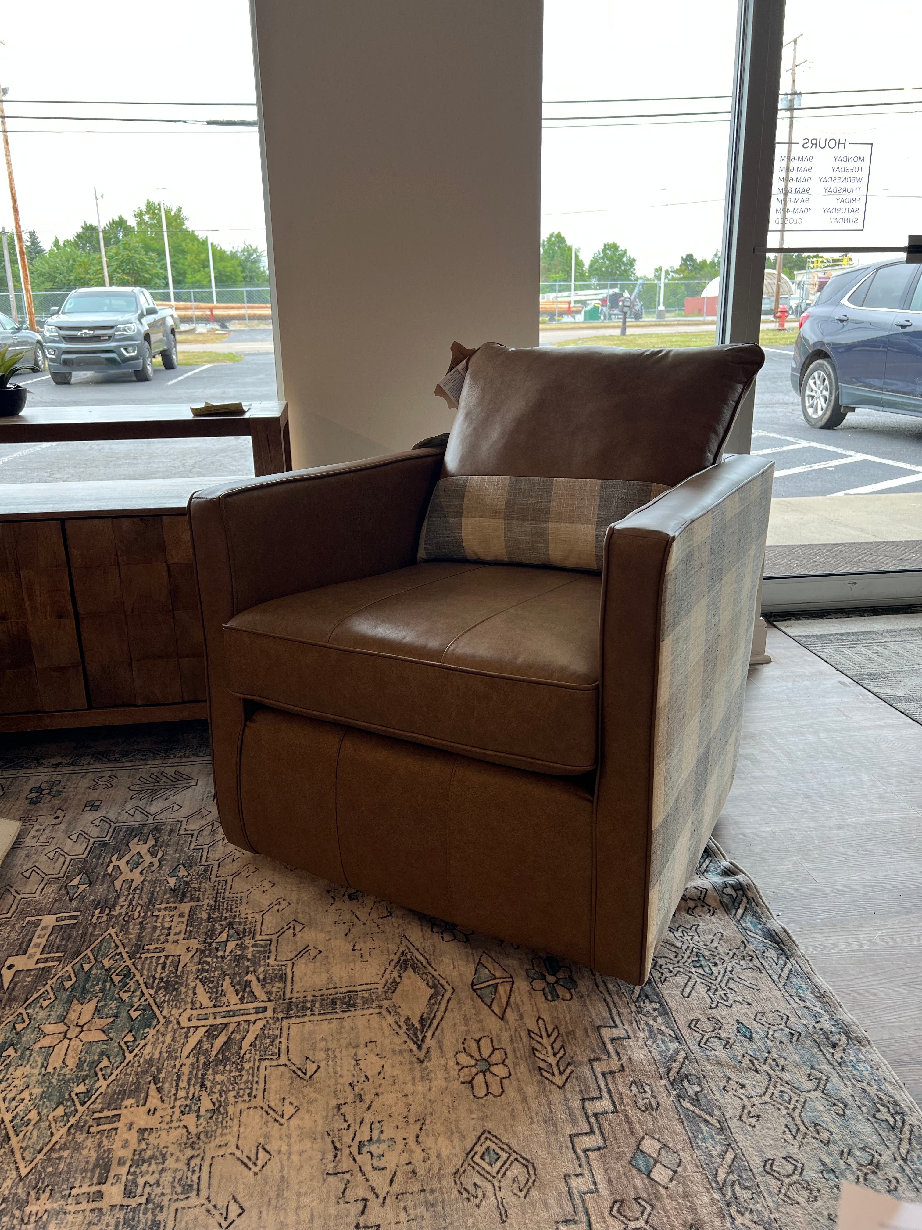 The Heidi Swivel Chair combines refined comfort and style. With a 360-degree swivel and low-profile barrel design, it offers a chic, tailored look. Adding to the distinguished look, the Field & Stream lineup pairs two leather/plaid combinations. The rich, top grain leather where your body touches perfectly compliments the trending plaid that wraps around the outside. Choose from a variety of designer select covers for an all-over centerpiece.