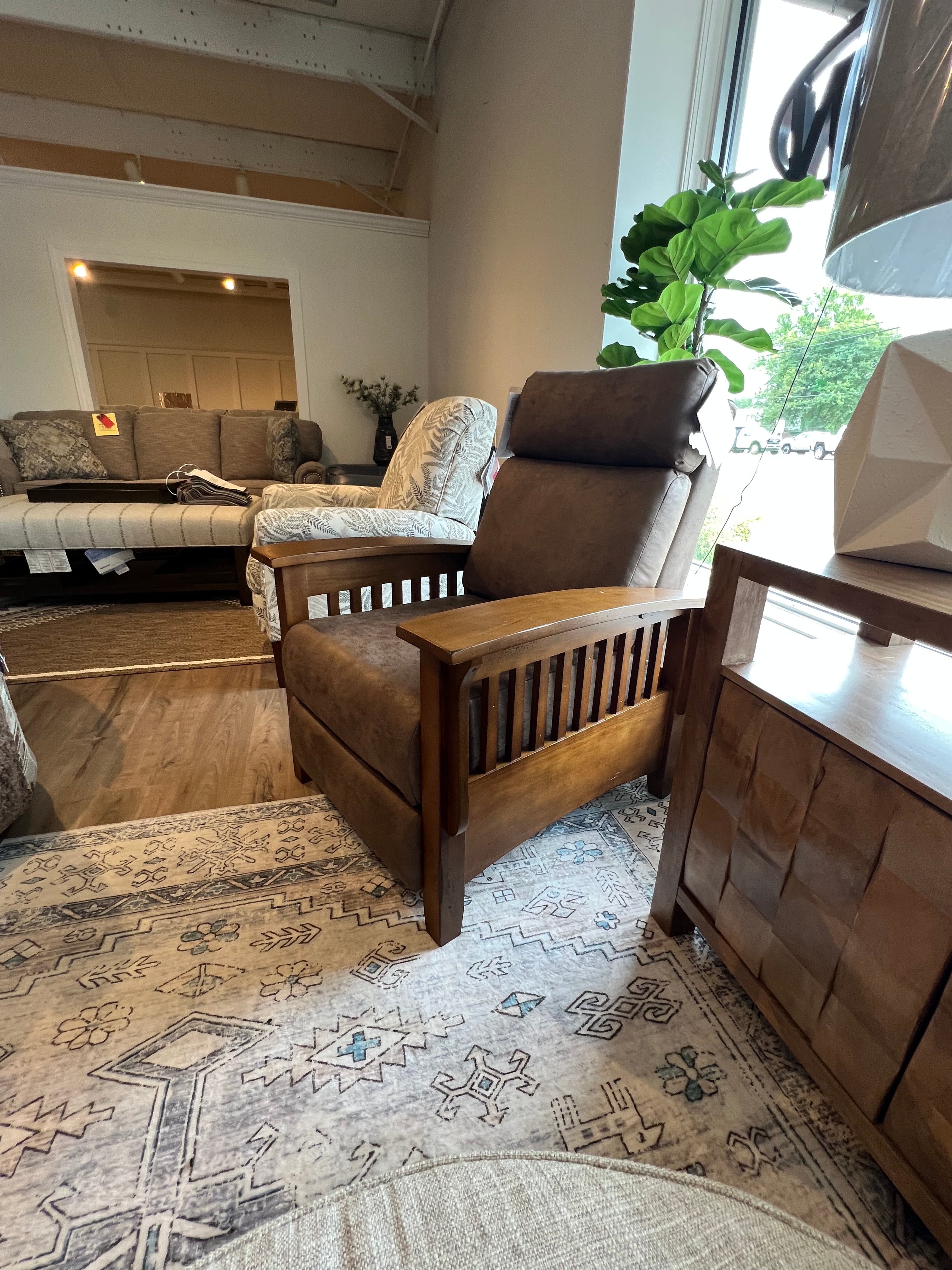 The Tuscan recliner is rustic and relaxing. This mission style recliner offers the solid, handcrafted look of the mission design philosophy. The Distressed Pecan finish gives the wood paneling a warm feel that will accent the fabric of your choice for the supportive cushions. Not only does this offer the style appeal of mission style furniture, but has the outstanding comfort that a recliner offers. Choose from a diverse cover offering to make it your own.